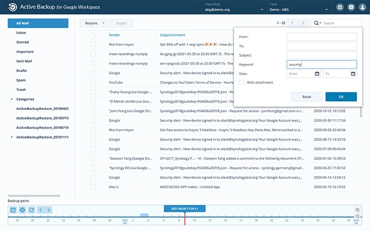 Là một tiện ích bổ sung miễn phí dành cho máy chủ NAS Synology, Active Backup for Google Workspace giúp bạn sao lưu nhiều tài khoản Google Workspace nếu như bộ nhớ của bạn còn dung lượng.