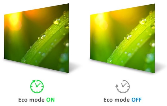 Chế độ Eco điều chỉnh độ sáng và cải thiện khả năng hiển thị, đồng thời giảm mỏi mắt và kéo dài tuổi thọ bóng đèn của màn hình. Với chế độ Eco, tuổi thọ của đèn nền LED cũng tăng lên đáng kể.