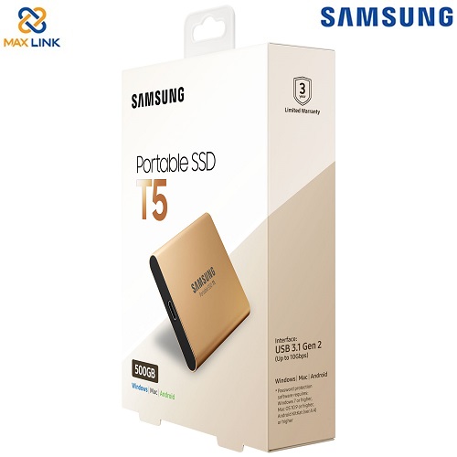 Ổ cứng SAMSUNG SSD T5 PORTABLE 500GB MU-PA500G/WW Gold là sản phẩm thuộc dòng SSD Portable của Samsung nâng cấp tốc độ truyền dữ liệu lên mức cao hơn và mang lại trải nghiệm mới với bộ nhớ ngoài. Với thiết kế nhỏ gọn và bền chắc, bảo vệ mật khẩu, T5 thực sự dễ mang theo và lưu trữ dữ liệu một cách an toàn. Tốc độ truyền nhanh