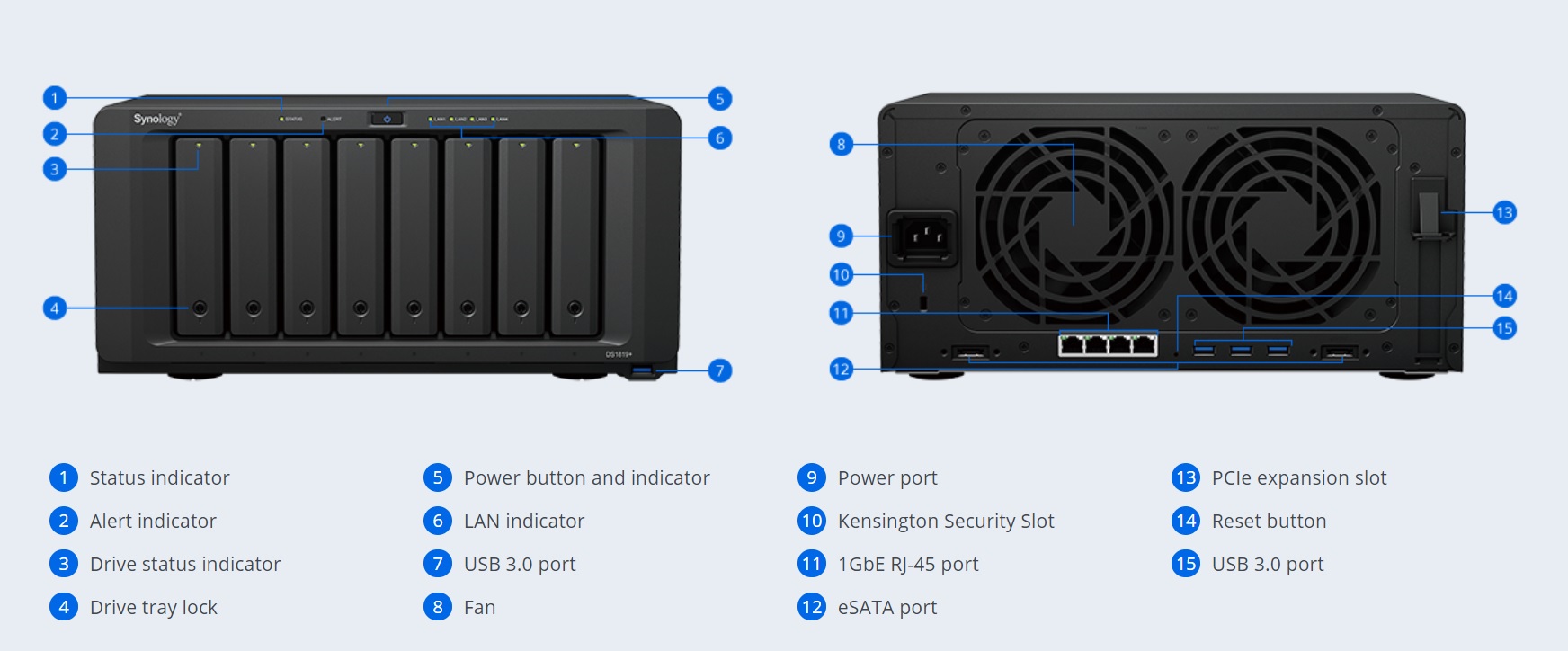 8-bay DiskStation (up to 18-bay), Quad Core 2.1 GHz, 4GB RAM (up to 32GB), 10GbE NIC & M.2 SATA SSD support (optional)