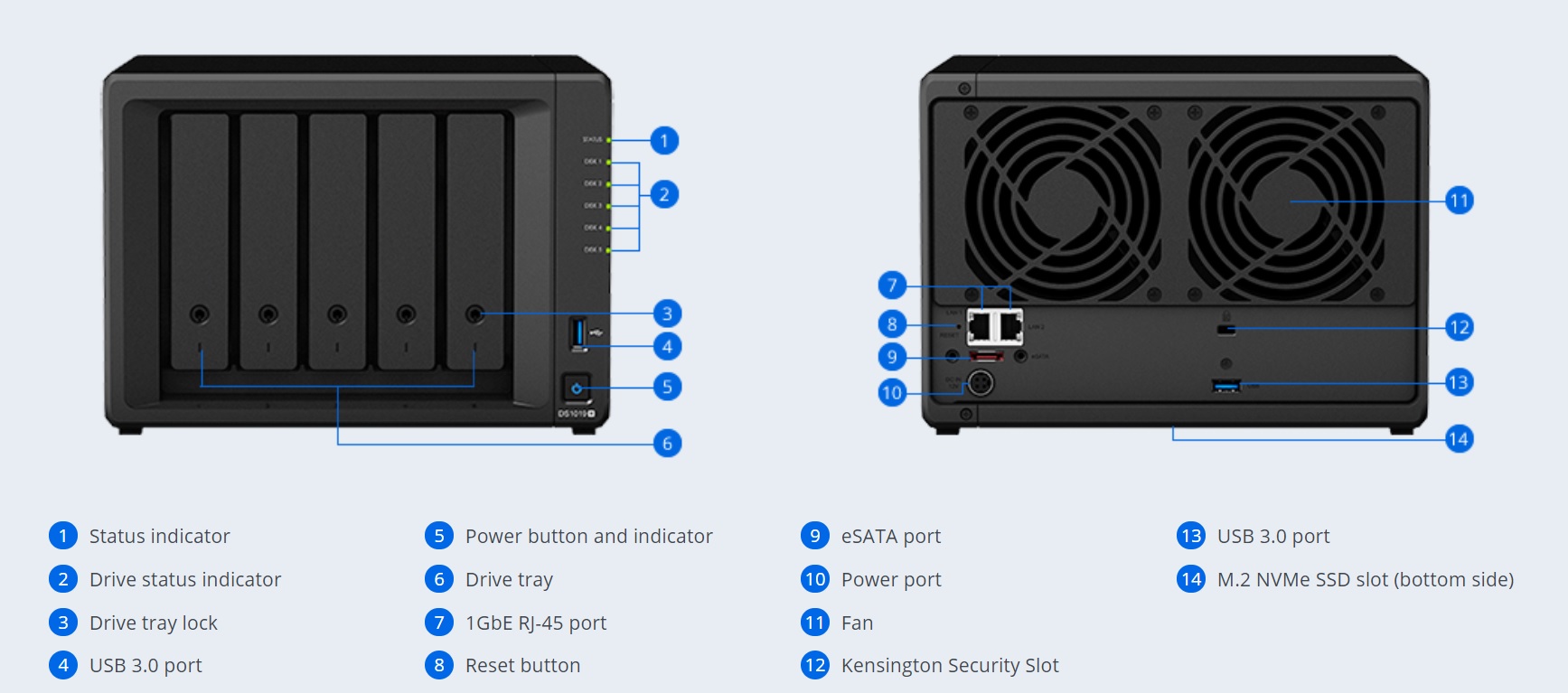 DS1019+ (8GB). 5-bay DiskStation (up to 10-bay), Quad Core 1.5 GHz( up to 2.3GHz), 8GB RAM (4GB x2), 10GbE NIC & M.2 SATA SSD support (optional)