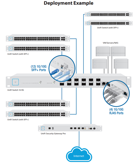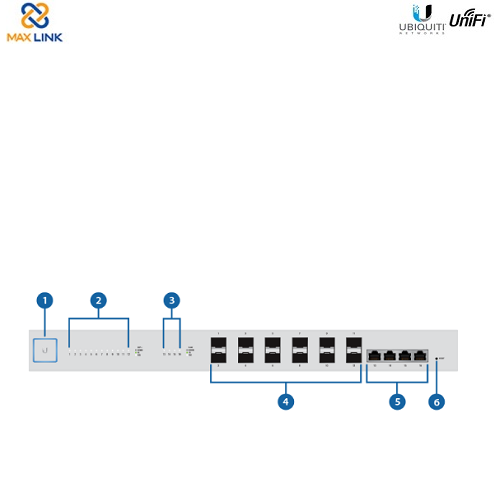 Thiết bị chuyển mạch UniFi Switch US-16-XG cung cấp 12 cổng quang SFP+ 10G và 4 cổng RJ45 10G cùng thông lượng không chặn lên tới 160 Gbps.